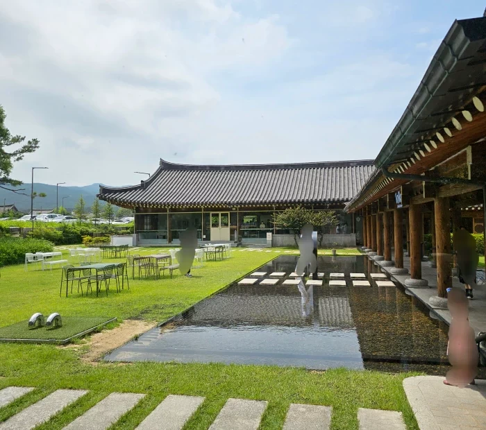 폼드팡은 한옥 스타일의 건물로 넓은 잔디마당과 함께 물정원이 있는 카페입니다. 이곳은 특히 자연 경관을 즐기면서 좋은 음료를 마시기에 최고입니다. 방문객들을 위한 잔디밭과 앉을 공간이 많은 덕분에 편안하게 시간을 보내기에 좋습니다.