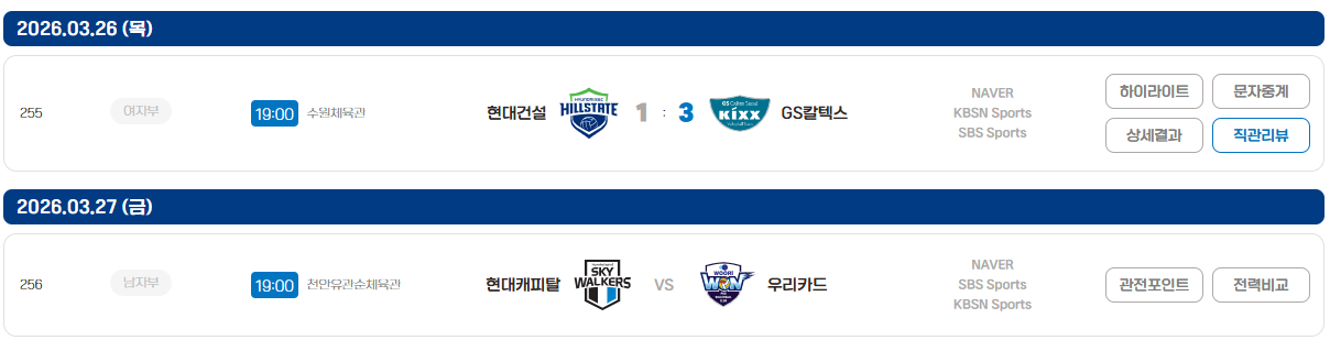 | 지금 시작된 봄 배구! 2025-2026 V리그 플레이오프 완벽 가이드 (1) | 2026.03.23 |