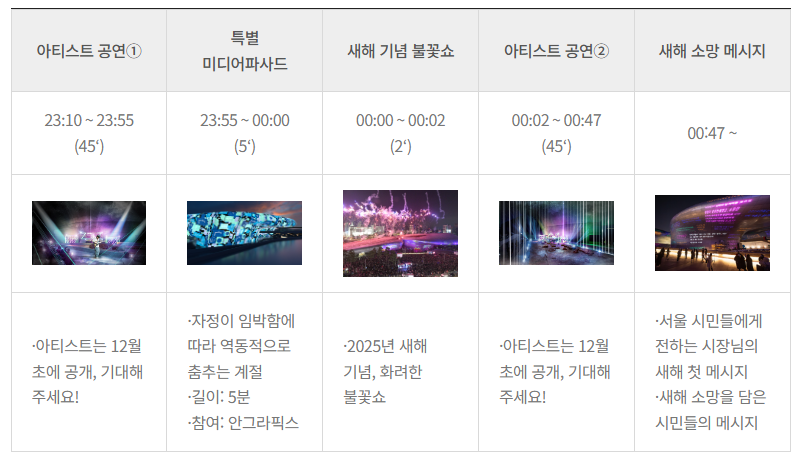 - 12월31일 23시부터 아티스트들의 사전공연, 불꽃놀이와 레이저 쇼 등이 펼쳐집니다.
