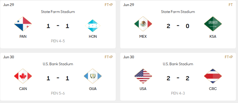과테말라가 캐나다를 승부차기로 꺾으면서 4강에 진출했으며, 미국과 코스타리카도 승부차기 끝에 미국이 승리하면서 과테말라와 맞붙게 됩니다. 이 경기 역시 7월 2일 수요일 오후 7시(ET)에 열릴 예정입니다.